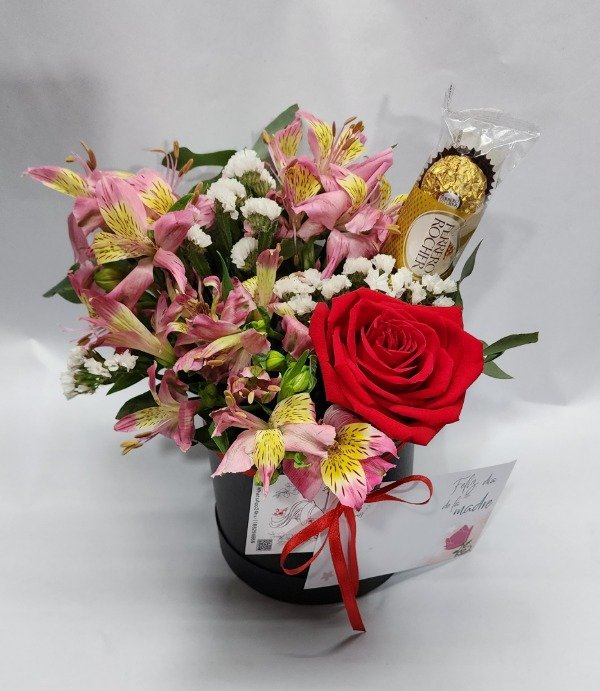 Mini box donde va una rosa roja importada acompañada de follajes, astromelias y un trio de bombones Ferrero Roche.