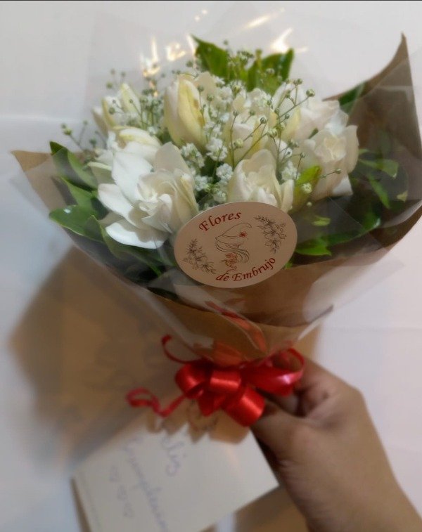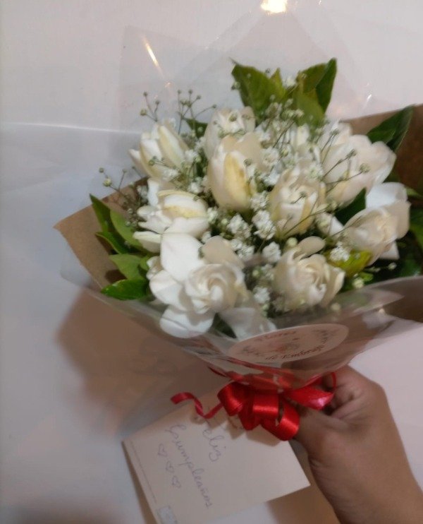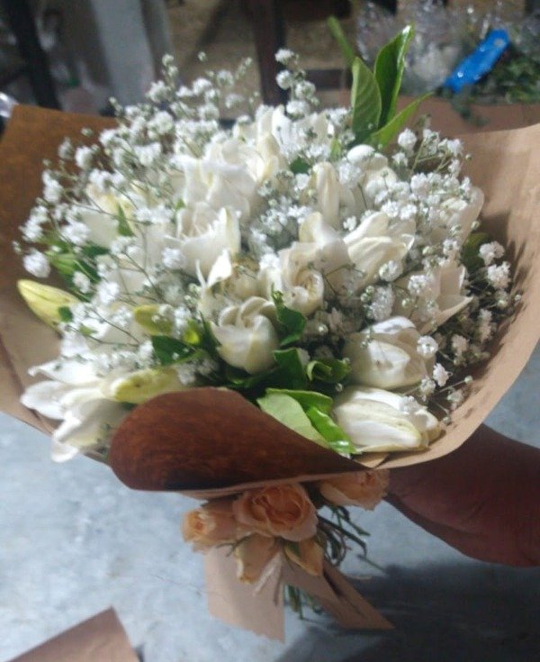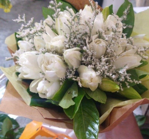 Bouquet de 12 jazmines con follaje, envuelto en papel madera y lazo