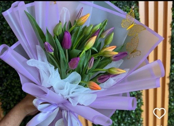 Ramo de Tulipanes: Que puede ser ramo de 6 tulipanes con colores a elegir o consulta stock de colores (blanco, rosado, amarillo, violeta, naranja, rojo), acompañado de follajes y envuelto en papel madera, o podes solicitar la cantidad de tulipanes que queres en tu ramo. Incluye dedicatoria.