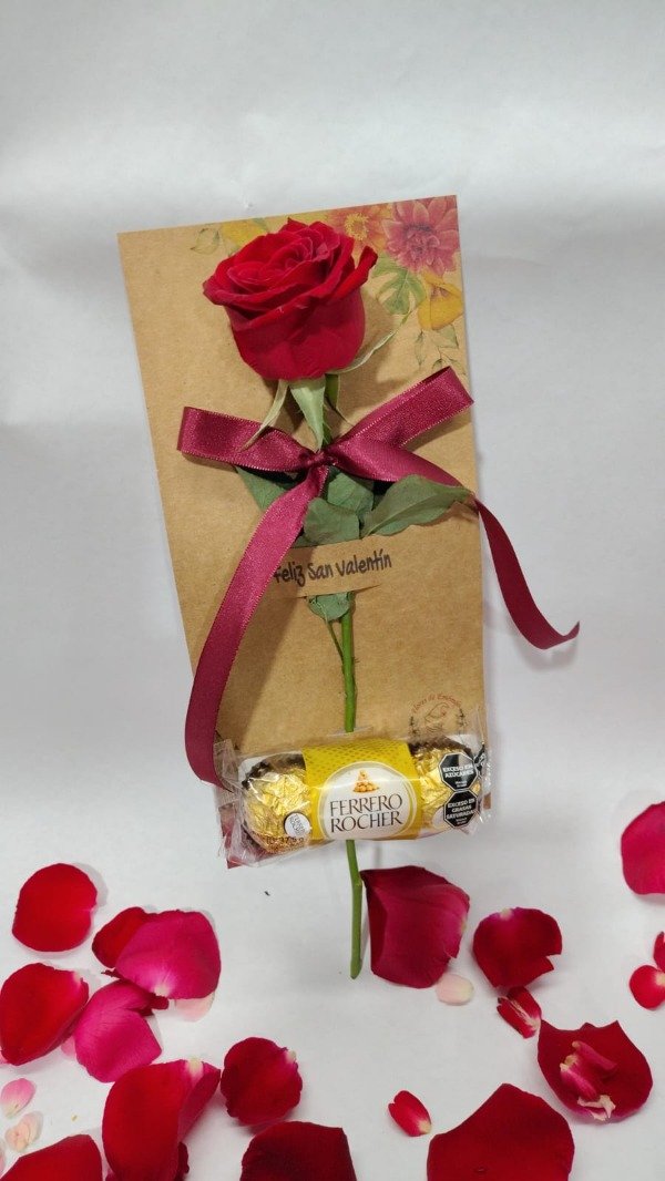 Una rosa de tallo largo insertada en porta tarjeta con mensaje "FELIZ DÍA" y acompaña un trio bombón Ferrero Rocher, podes solicitar que acompañe mensajito en una tarjeta adicional.